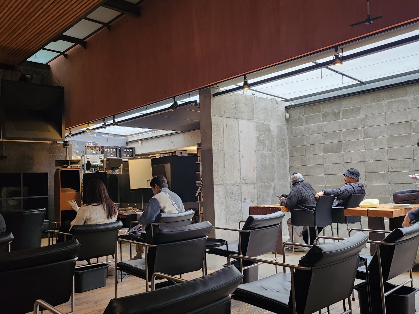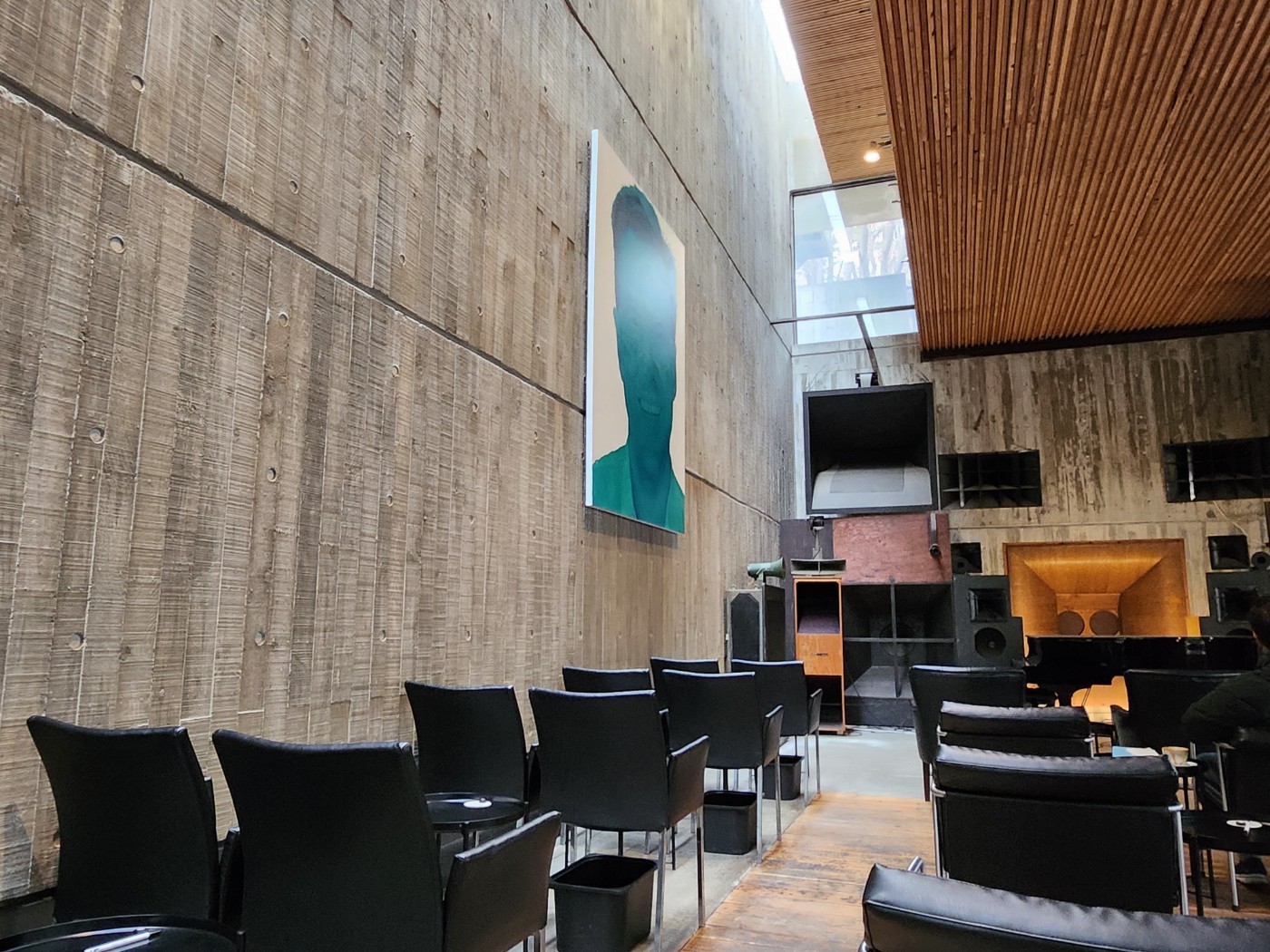 공간/느낀 점 콘크리트를 활용하여 만든 박스형태로 자연과 하나 된 차분한 외관과 나뭇결? 무늬로 새겨진 노출콘크리트와 목재 천장, 천창으로 구성된 고요한 내부공간과 천창으로 들어오는 빛을 통해 자연속에서 음악을 듣는 기분을 연출해 준다. 전면에는 다양한 스피커가 비치되어 있고, 조용한 공간에 울리는 음악을 통해 뮤직스페이스가 음악감상을 위한 공간으로 구성되어 있는 것을 느낄 수 있다.