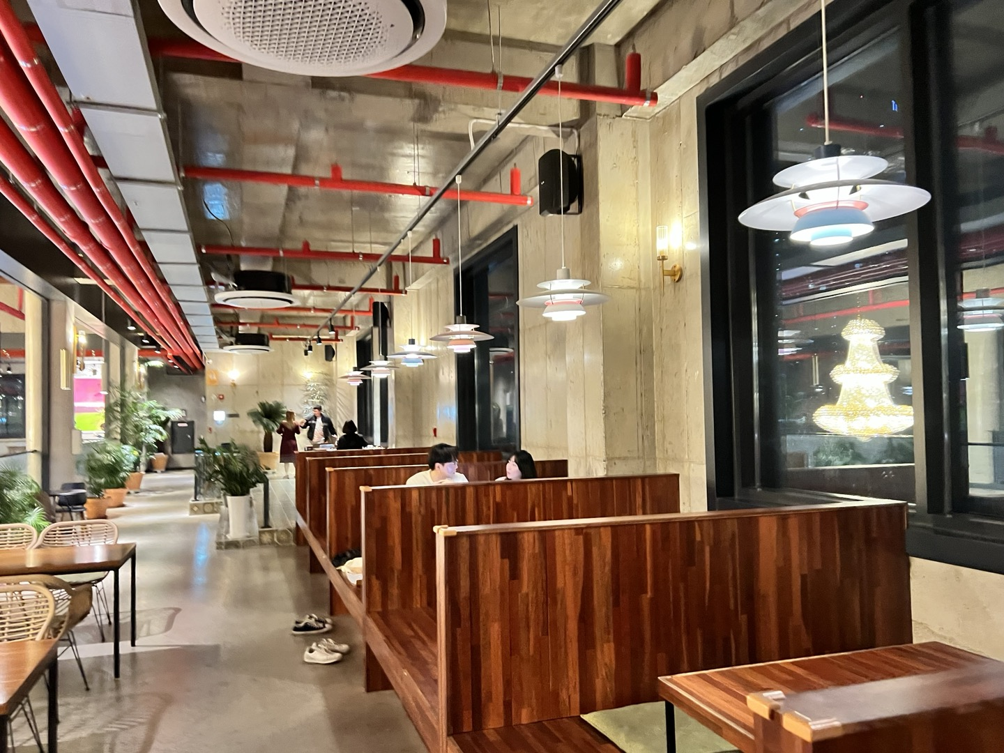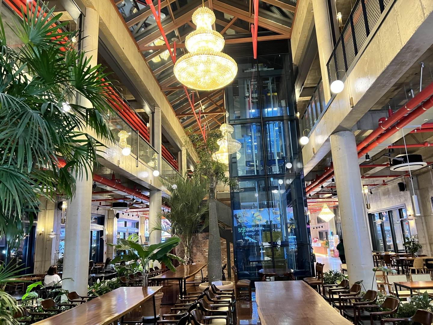 층고가 높기 때문에 개방적이고, 샹들리에 식재를 통해 신선한 공간의 느낌을 준다!! 2층임에도 불구하고 엘리베이터가 있는 센스!! 2층 전체에 테이블이 있기 때문에 많은 인원을 충분히 수용할 수 있다. 넓은 창문들을 통해 외부를 바라보기 좋다.