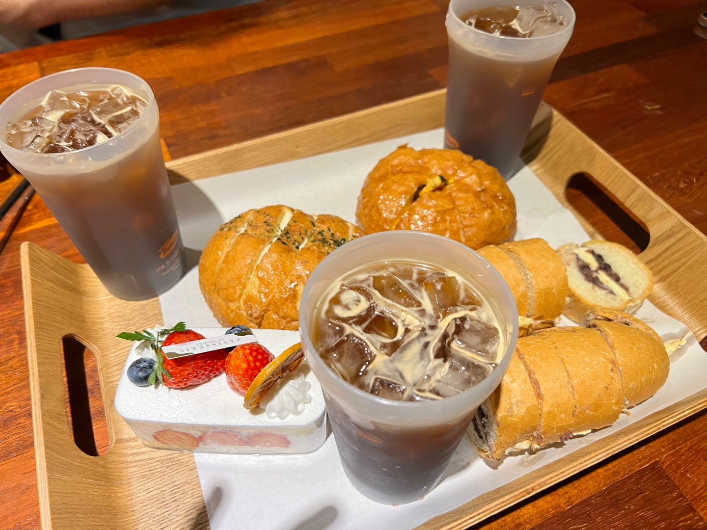 아이스아메리카노와 잘 어울리는 메뉴들을 주로 먹었다. 달콤한 생크림과 상콤한 딸기가 잘 어울어진 딸기 생크림 케익! 딸콤한 팥과 버터의 풍미! 바삭한 바게트가 함께 어울어져 있는 앙버터, 마늘의 알싸한 향과 크림이 바삭한 바게트와 만나 달달하고 마늘의 향을 전해 주는 마늘바게트, 단호박은 녹진한 단맛과 크림으로 존재감을 뿜뿜 발산하는 단호박크림바게트?까지 모든 메뉴가!쌉쌀하며 고소한 커피와 너무 잘어울리는 조합이다. 남은 빵은 포장해 갈 수 있도록 봉지를 제공해 준다.