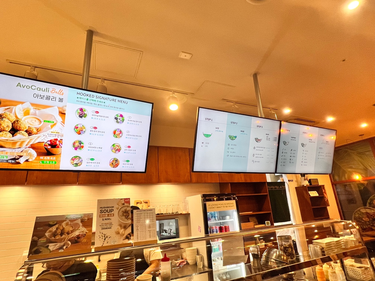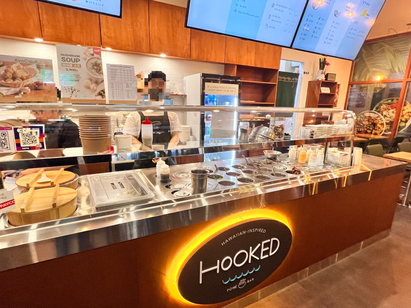투명한 유리의 외관가 따뜻하고 깔끔함이 인상 깊은 매장의 모습이다. 재료 진열대?에는 재료가 다 보이기 때문에 신선도와 청결함을 더욱 느낄 수 있고, 창가의 바테이블과 안쪽 4인테이블이 비치되어 있는데 창밖을 바라보며 맛있는 포케를 먹는 감성에서 여유감을 느낄 수 있다.
